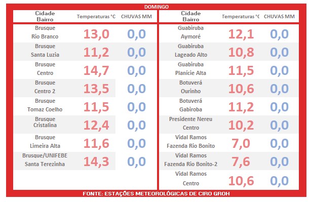 A tabela abaixo então apresenta as temperaturas mínimas registradas logo após o amanhecer, ilustrado nos números em vermelho.