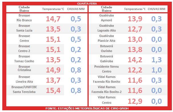 As informações, pois, são do observador do tempo Ciro Groh, que acompanha o clima de Brusque e região desde 1987.