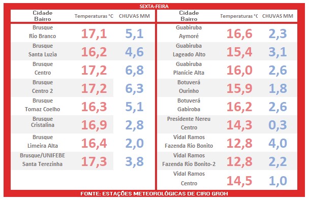 A tabela abaixo então apresenta as temperaturas mínimas registradas logo após o romper da aurora desta sexta-feira, ilustradas em vermelho.