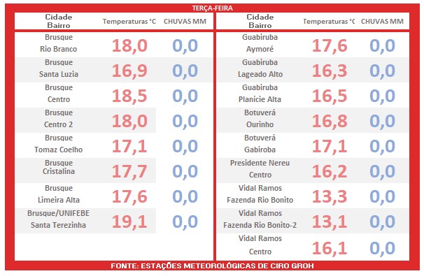 As temperaturas, por sua vez, tendem a permanecer limitadas, com máximas raramente excedendo os 22°C em todo o Vale do Itajaí-Mirim.