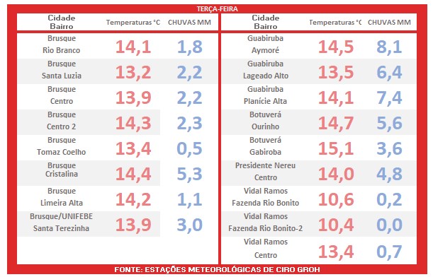 Dando continuidade à matéria, o foco agora é o monitoramento das condições climáticas observadas durante a madrugada desta terça-feira em todo o Vale do Itajaí-Mirim, realizado em parceria com as estações meteorológicas de Ciro Groh.