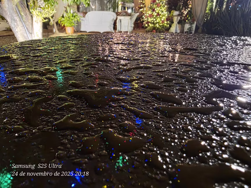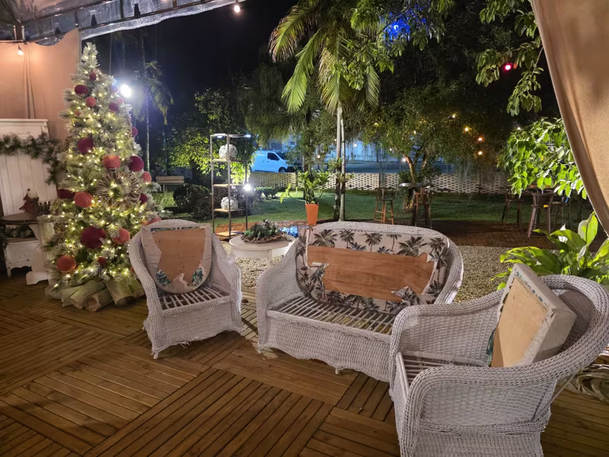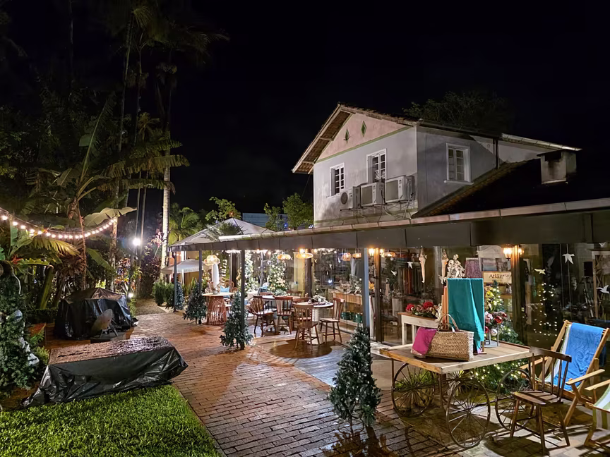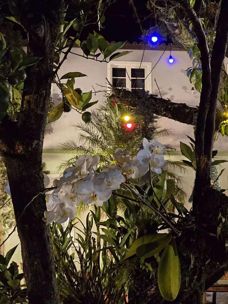 A iluminação colorida e o presépio montado no jardim ampliam essa percepção ao realçar as linhas da estrutura, completando a leitura do conjunto e mantendo o caráter acolhedor do local.