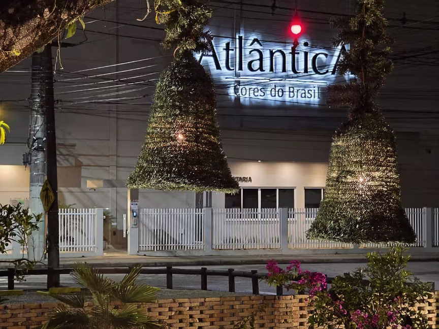 No interior, o showroom recebeu elementos de ambientação alinhados ao espírito natalino, reforçando o diálogo entre tradição e contemporaneidade que marca o percurso do grupo Atlântica.