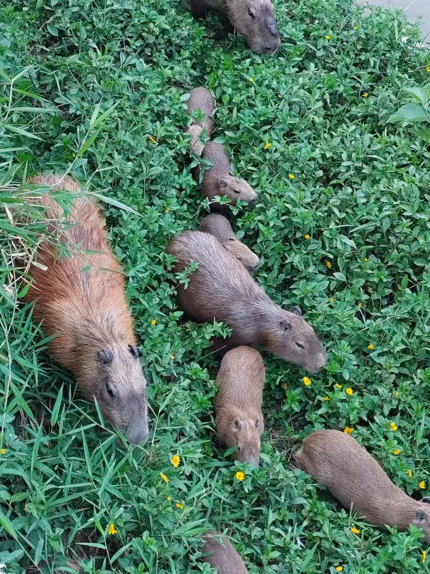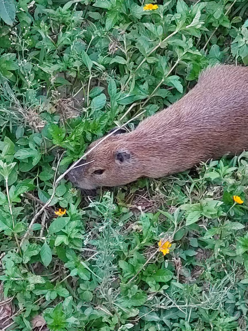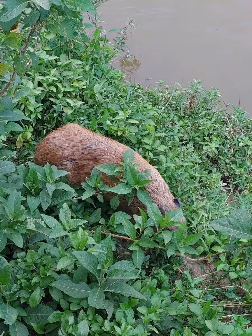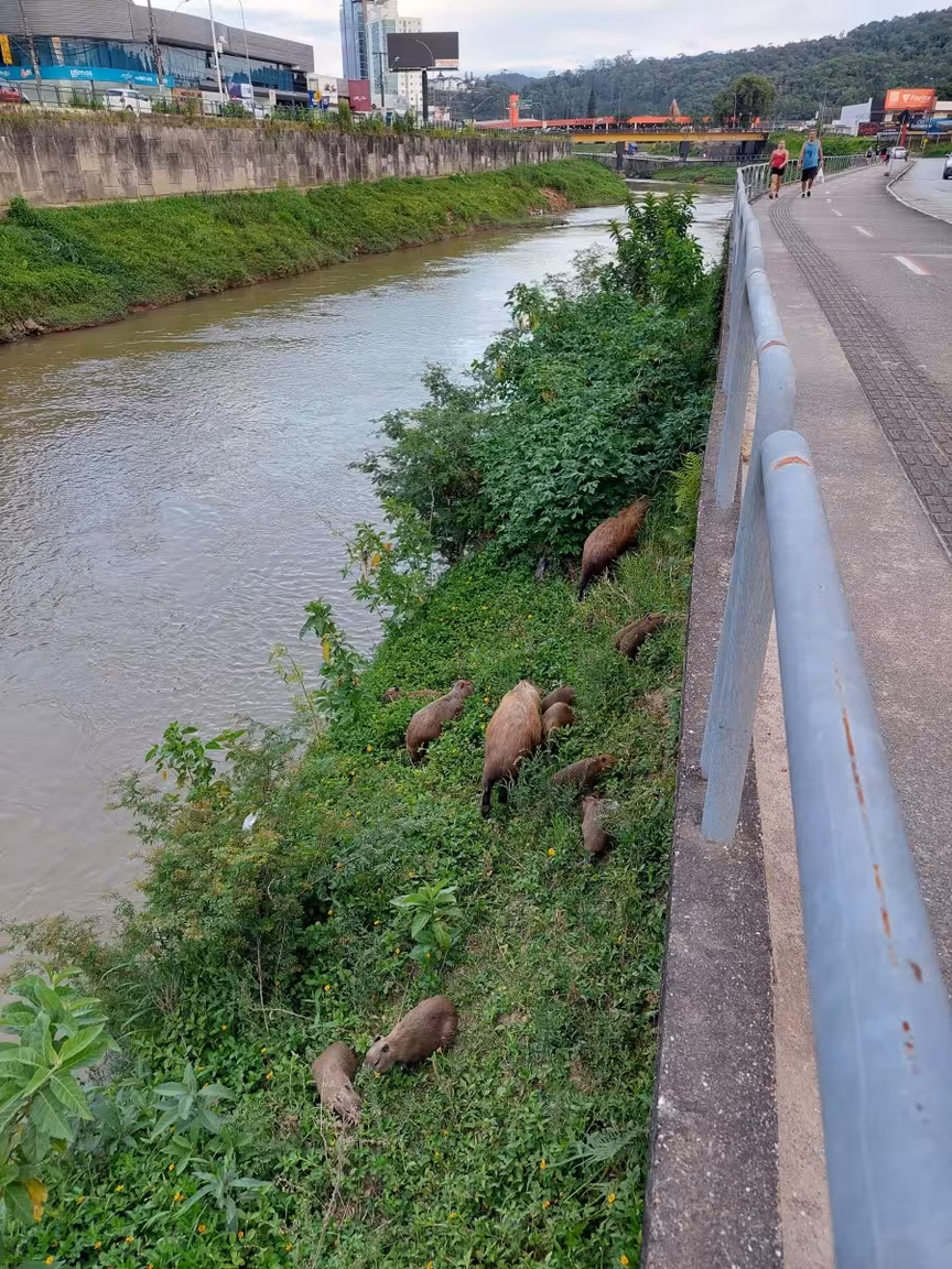 No lugar do espetáculo do entardecer exposto no céu do município, uma família de capivaras, com idades e tamanhos diversos, veio protagonizar o momento. Cerca de 20 desses animais passeavam à beira do rio Itajaí-Mirim e as pessoas que passavam pelo local paravam para tirar fotos e acompanhar a movimentação.