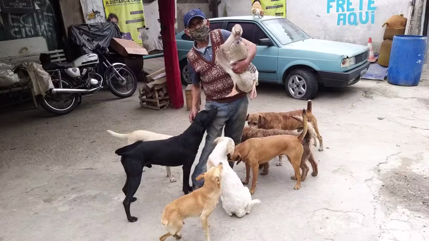 VÍDEO: Borracheiro de Brusque faz sucesso na internet ao passear com cachorros e gansa