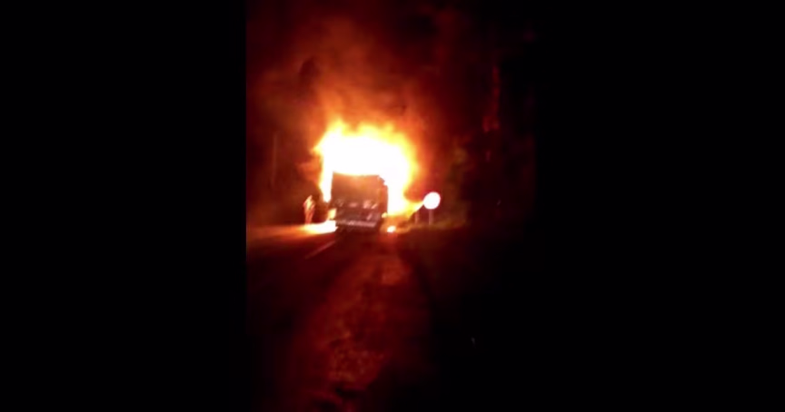Caminhão que transportava gado pega fogo na BR-470, em Rodeio