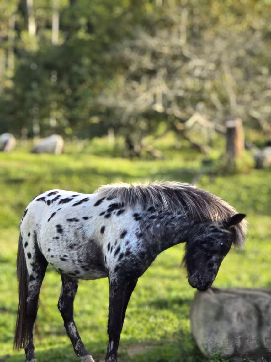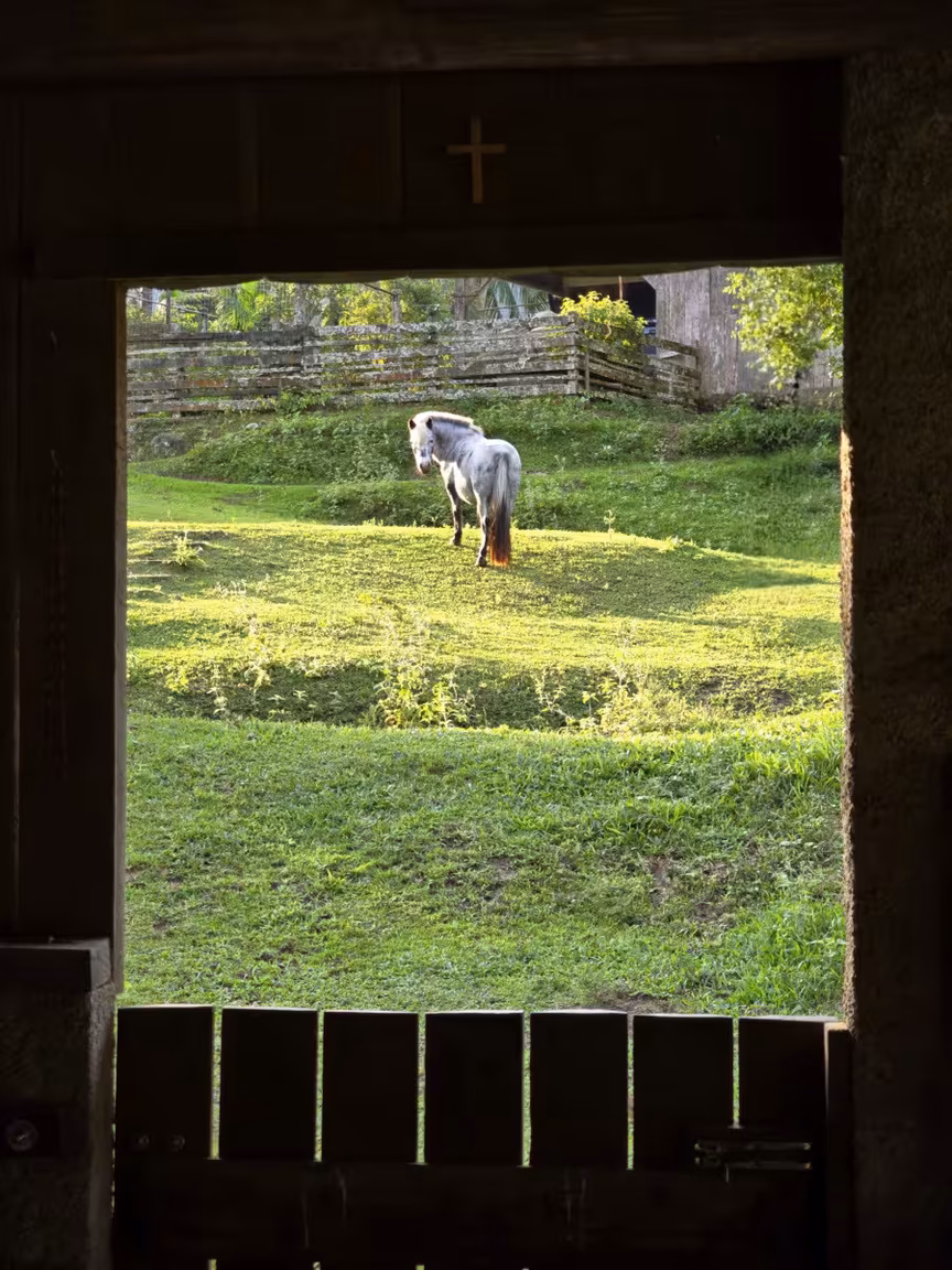 O som da água deslizando sobre as pedras se mistura ao trote delicado dos pôneis no gramado, compondo uma sinfonia natural que acalma a alma e aquece o coração.