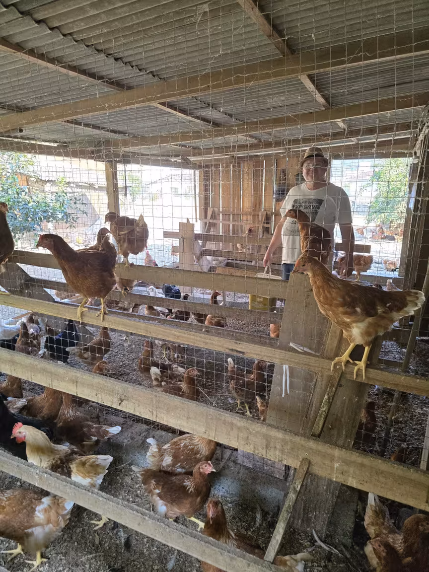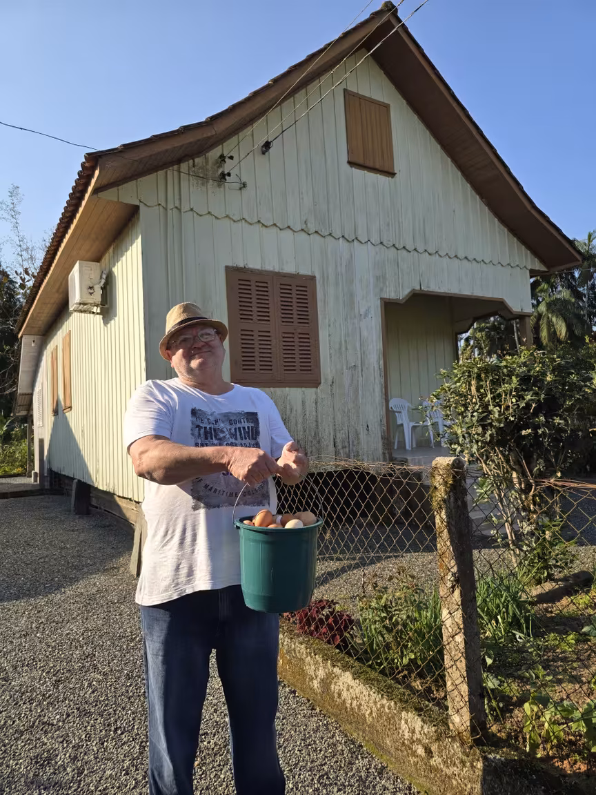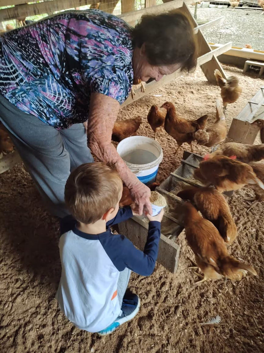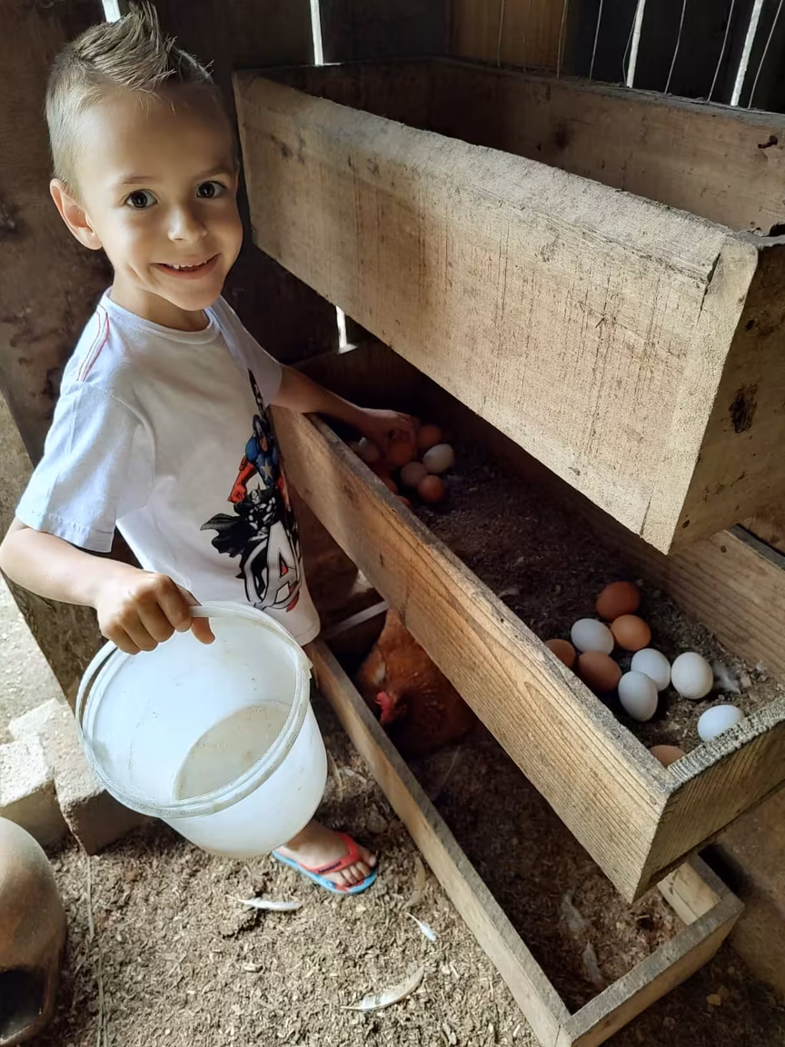 Mas o carinho de Miro não se limita à manutenção do espaço. Sempre que possível, ele permite que seu netinho, que adora participar, recolha os ovos, transformando essa atividade em um momento especial entre avô e neto.