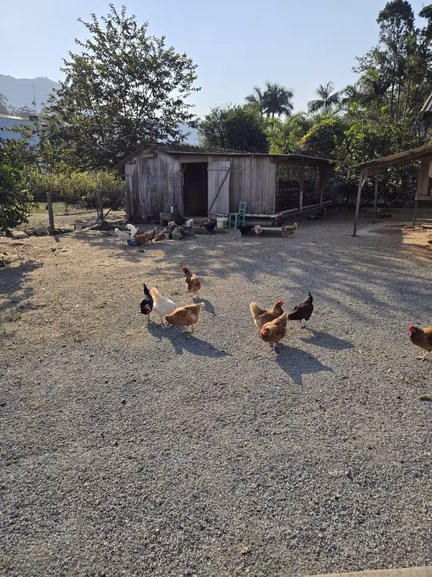 Veja a seguir as imagens de seu curral, que abriga quase 400 galinhas.