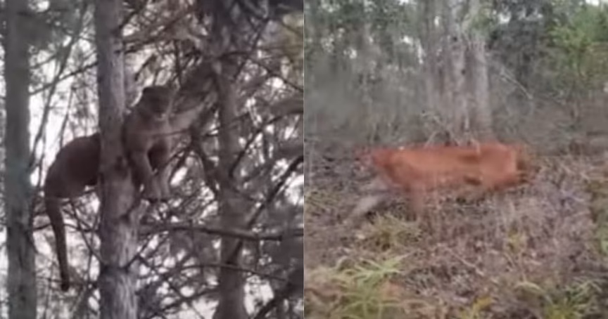 De acordo com um vídeo divulgado pelo proprietário do local, Juliano Bertoni, o animal subiu para fugir dos cães da propriedade.