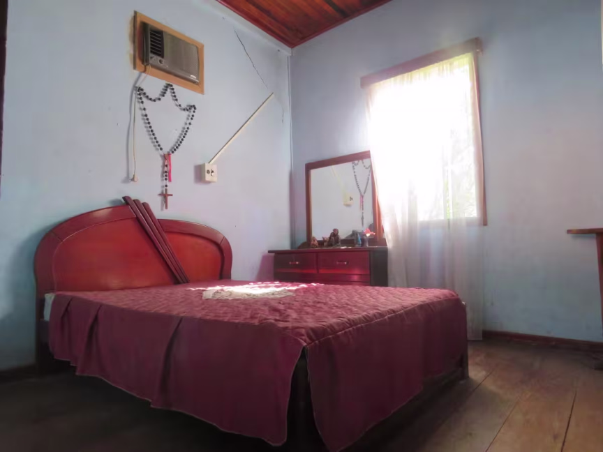 No quarto do casal, a cama, em tons amadeirados, está feita. Na cabeceira, um grande rosário antigo contrasta com um aparelho de ar-condicionado.