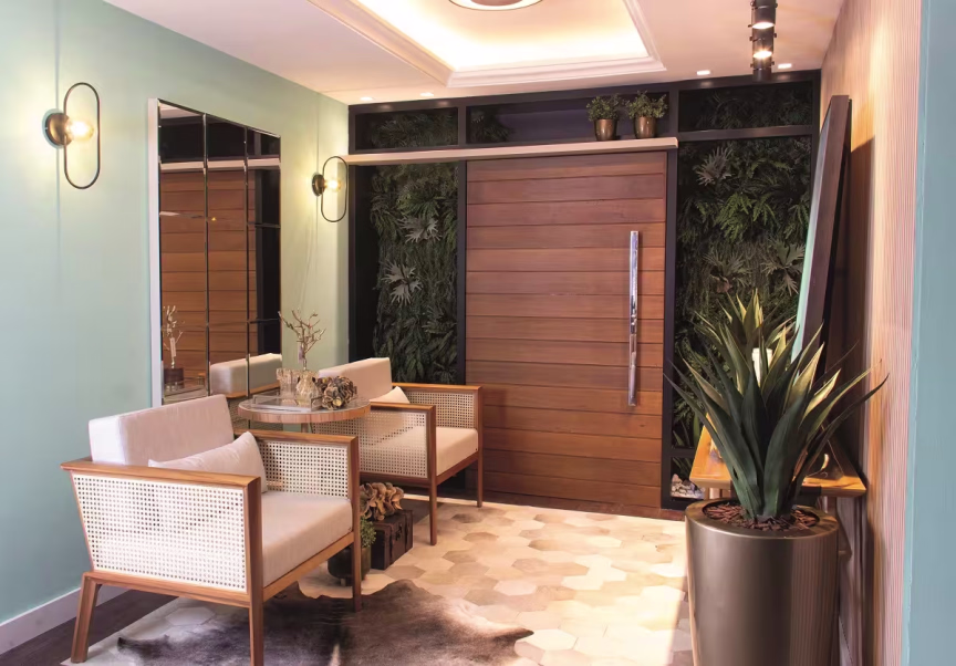 O espaço foi projetado pensando que o hall necessita ser impactante e acolhedor ao mesmo tempo, pois é o contato inicial com o ambiente interno. Foi escolhida a cor Neo-Mint, uma das tendências de 2020, proporcionando toques contemporâneos ao ambiente. Contrastando com essa cor, foi usada a madeira trazendo aconchego para o hall, e ainda, uma parede com vegetação vertical incorporando personalidade a esta área.