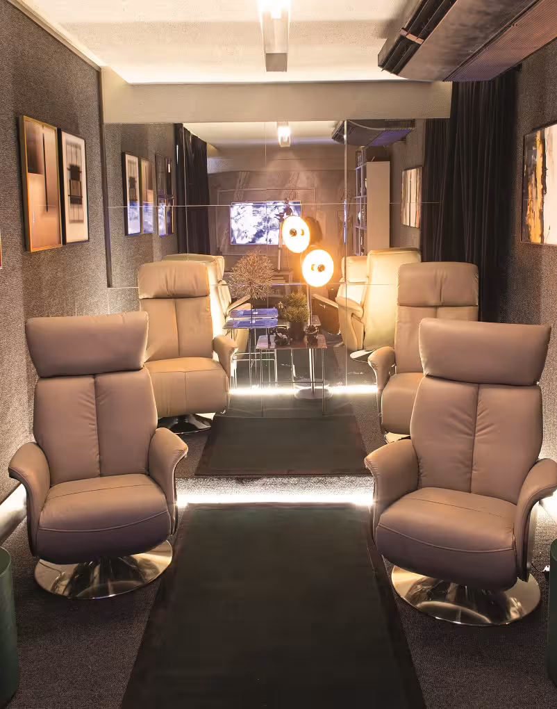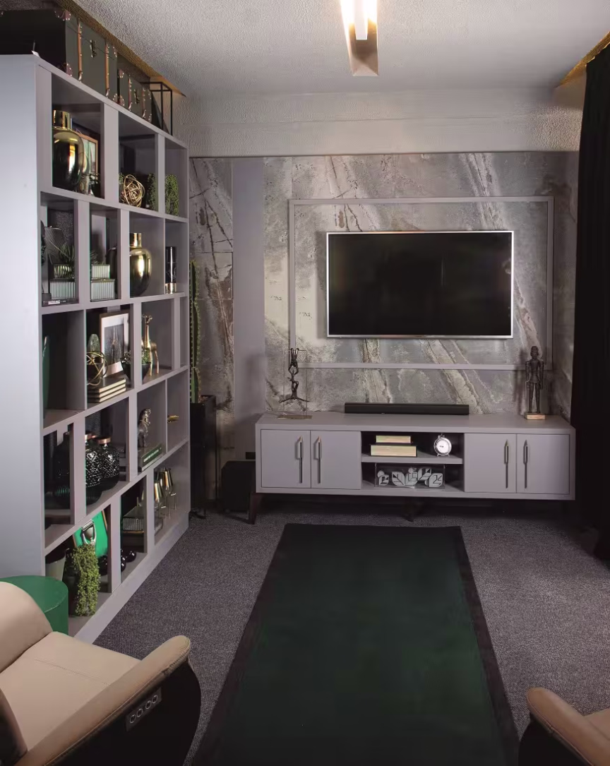 O ambiente de 18m² se enquadra no estilo contemporâneo e foi pensado em aproveitar os momentos em casa para assistir um filme com a família e amigos, tornando essa ocasião divertida e especial. Composto com 04 poltronas revestidas em couro natural, o ambiente ainda conta com detalhes em cinza, verde e preto do carpete à marcenaria e, um projeto diferenciado para a área de iluminação.