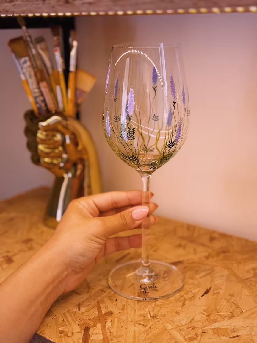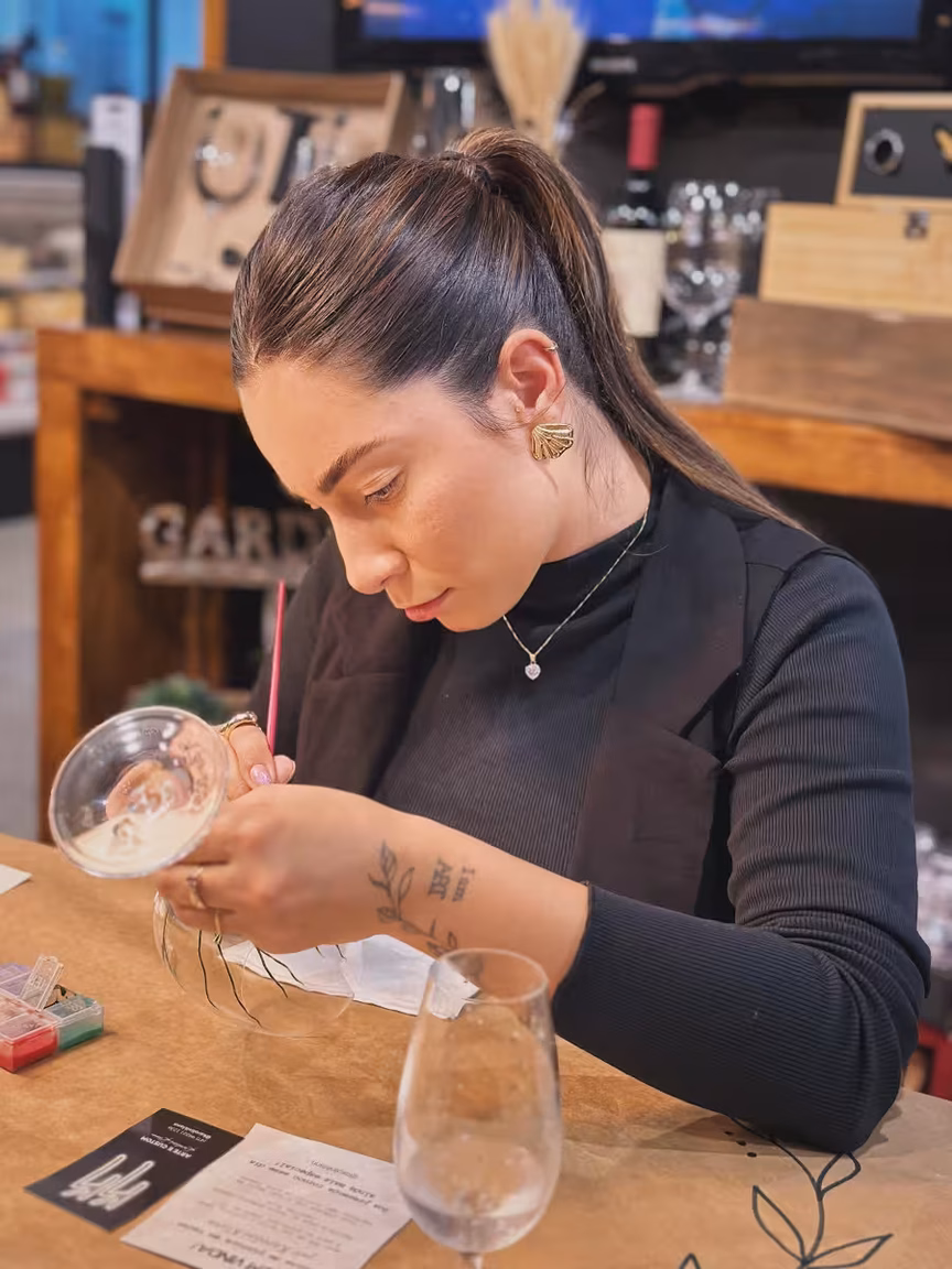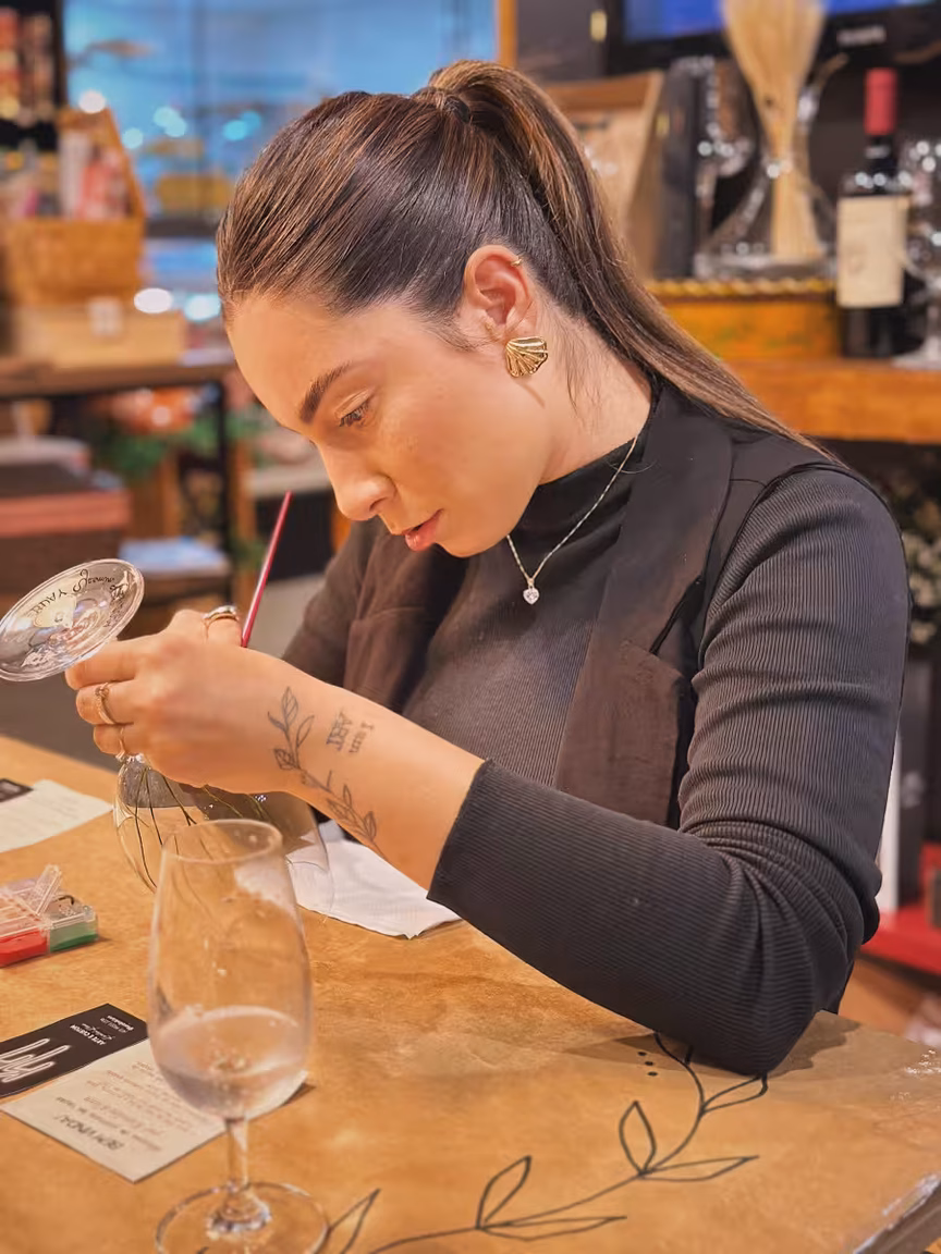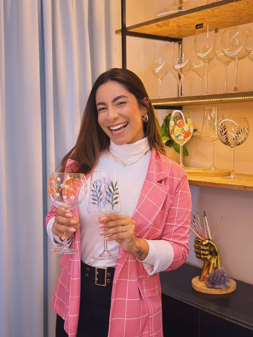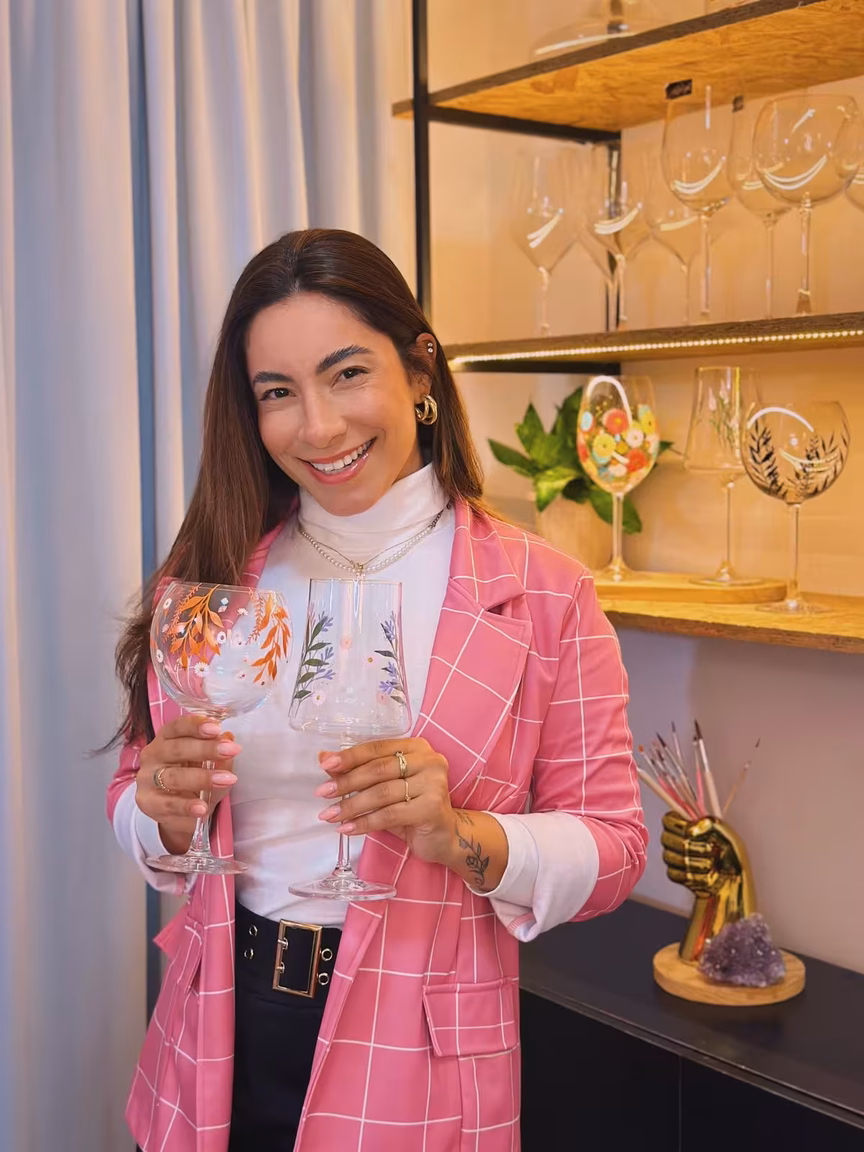 Karolini, conhecida por suas delicadas e apaixonadas pinturas à mão, tem uma habilidade única; ela transforma taças de cristal em verdadeiras obras de arte.