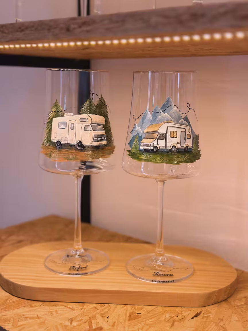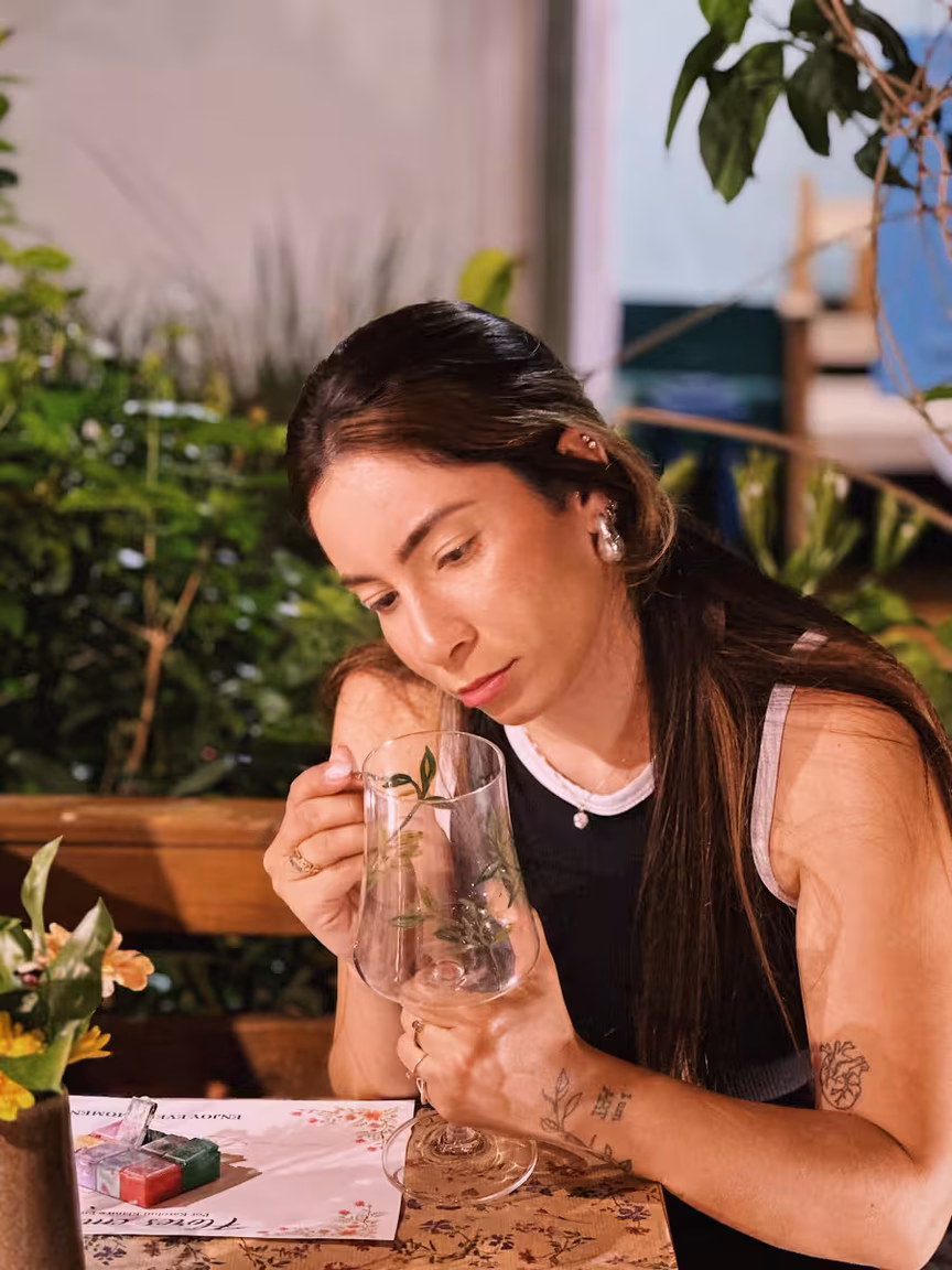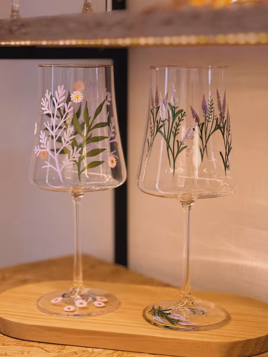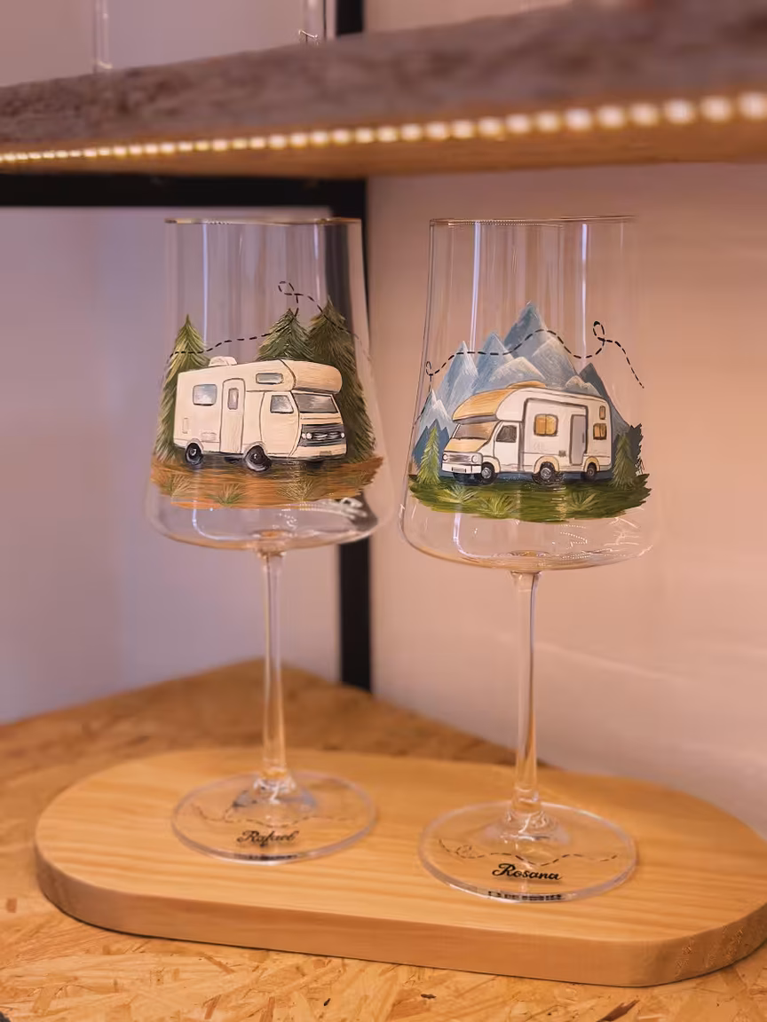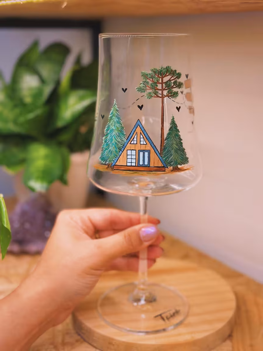 Karolini, conhecida por suas delicadas e apaixonadas pinturas à mão, tem uma habilidade única; ela transforma taças de cristal em verdadeiras obras de arte.