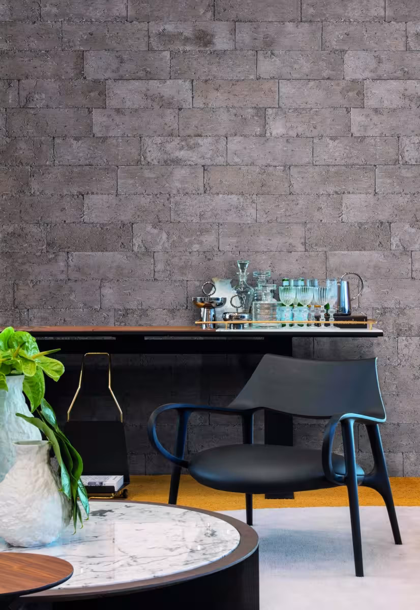 Sucesso nos anos 40, o granilite e suas variações prometem voltar com tudo ao décor. Com ares vintage, o efeito colorido causado pela junção da areia, água, cimento e grânulos minerais foi revisitado por diversas marcas, que apostaram em revestimentos com um forte apelo afetivo inspirados pelo material. A Arauco, surpreendeu trazendo o revestimento em MDF com estampa de granilite. Além disso, a marca ainda apresentou suas novas cores: Lord (azul) e Gaia (terracota).