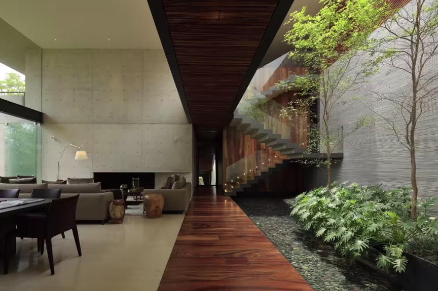 Formado por diversas espécies diferentes de vegetações, este jardim situa-se no centro de um espaço de circulação da residência projetada por Justin Humphrey, na Austrália. Ele fica abrigado sob um pergolado em vidro e integra a área de circulação com os demais cômodos sociais.