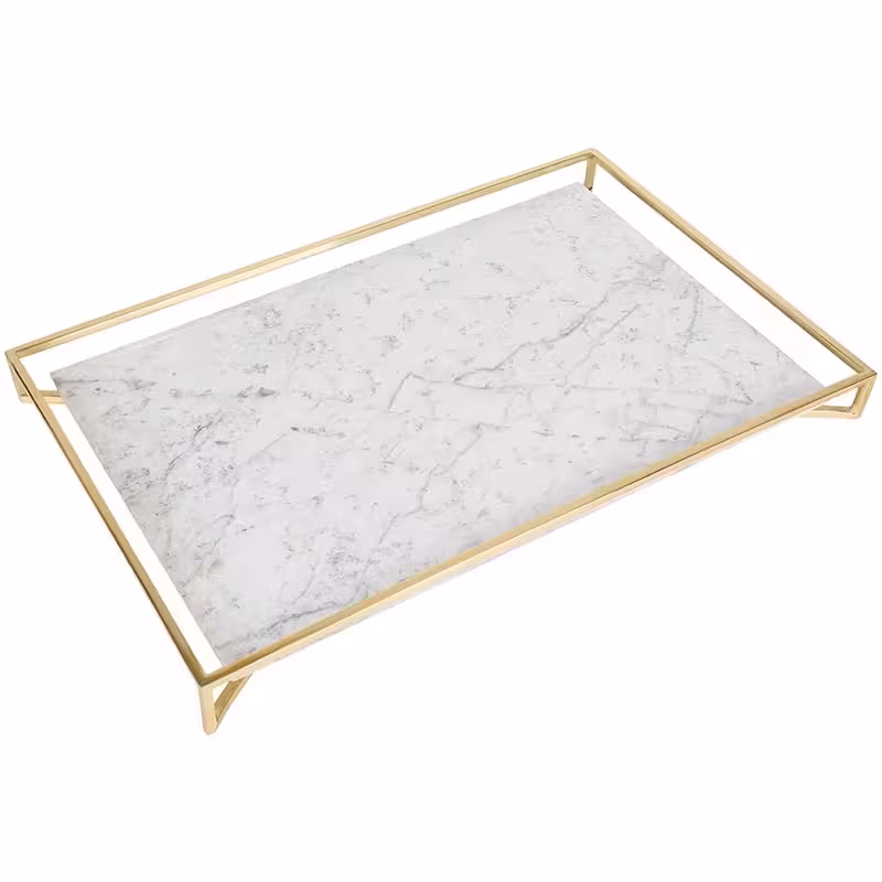 Bandeja retangular em pedra mármore natural Carrara, em tamanho grande, sob base em Latão e estrutura formada com alças. Esta bandeja está à venda no site www.theodorahome.com.br. por R$ 2.249