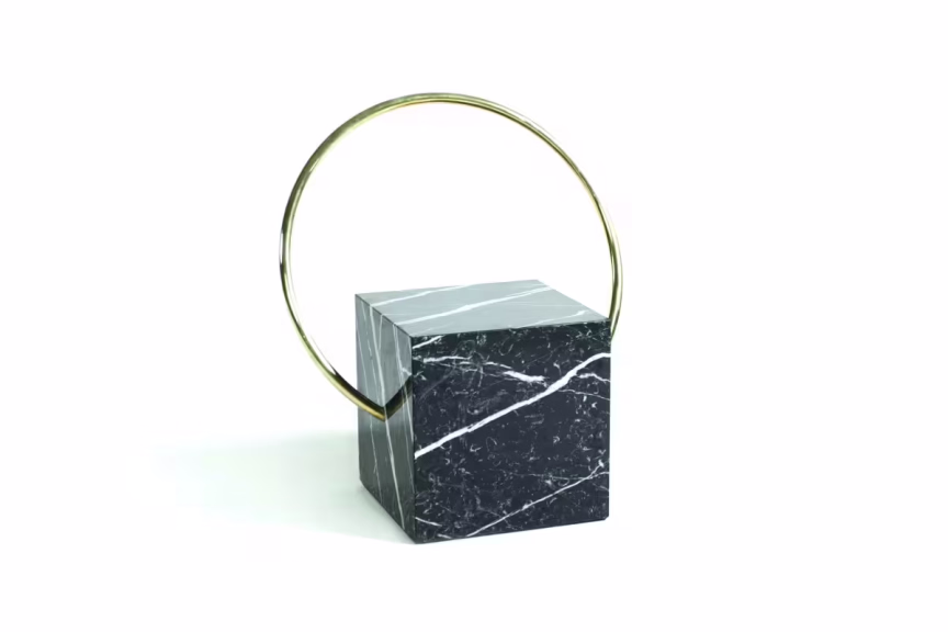 Banco Aro Mármore Nero Marquina e Latão, assinado pelo estúdio de design O Formigueiro, que criou uma edição limitada de 06 peças desse mobiliário. Possui dimensões de AxLxP 75x70x50cm e pode ser encontrada no site www.boobam.com.br com valor de R$ 8.500.Vaso Marmi em formato bojudo, de cerâmica com design de mármore em cor mesclada de branco e cinza. Está disponível no site www.theodorahome.com.br com valor a partir de R$ 159.Mesa Cosmo Nero, com tampo em madeira natural e base em pedra de mármore nero. Possui dimensões de AxLxP 45x30x30cm, encontrada em www.theodorahome.com.br por R$ 1.949Com um toque de sofisticação, o vaso Ivy é produzido em cerâmica com acabamento marmorizado e detalhe em dourado. Está disponível em www.westwing.com.br por R$ 94,90