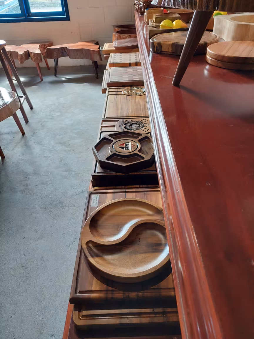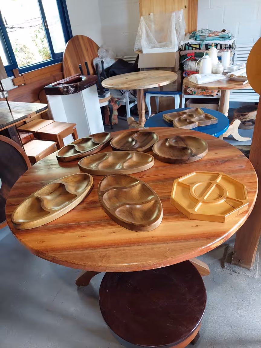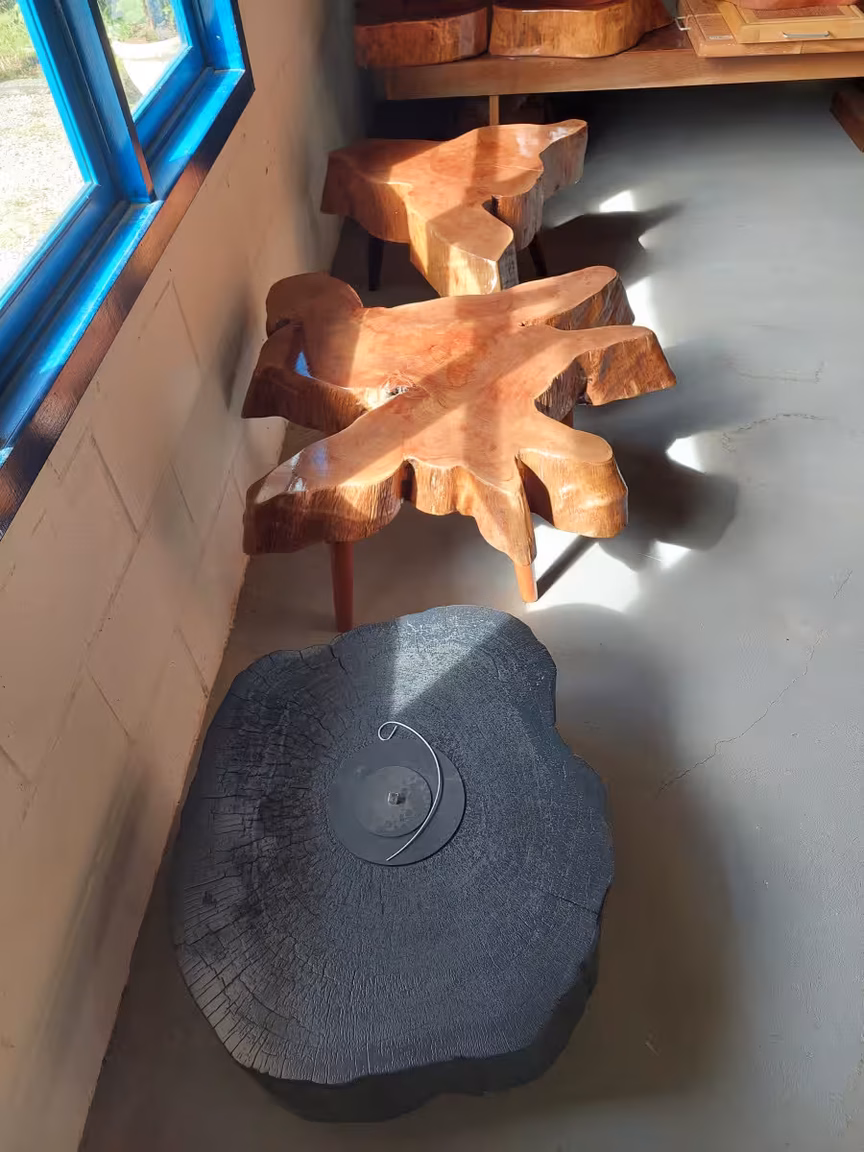 Com habilidade e criatividade, ele cria mesas, cadeiras, cubas para pias e muitas outras peças impressionantes a partir de troncos de árvores e restos de madeira.