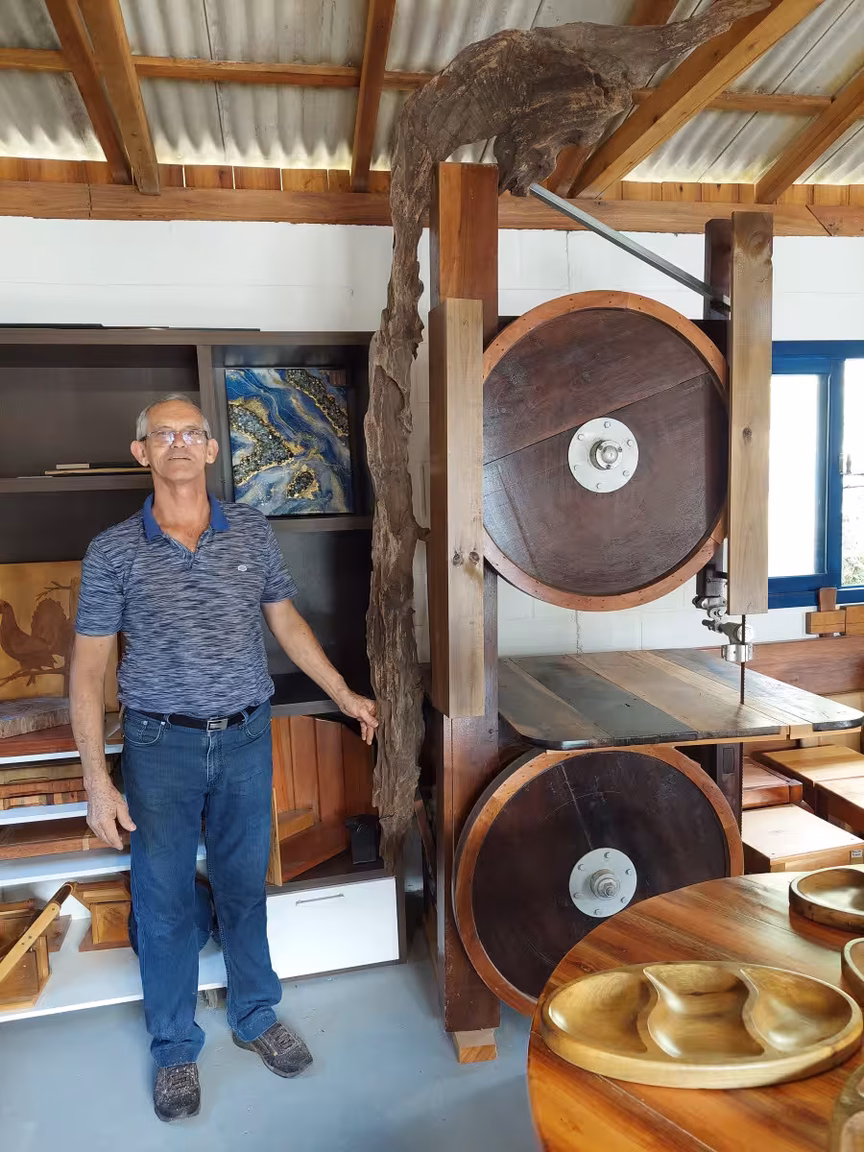 Morador do bairro Centro, em Guabiruba, Remaclo Debatin é um verdadeiro mestre na transformação de madeira bruta em arte. Então, suas produções únicas encantam e inspiram a todos que têm a oportunidade de admirá-las.