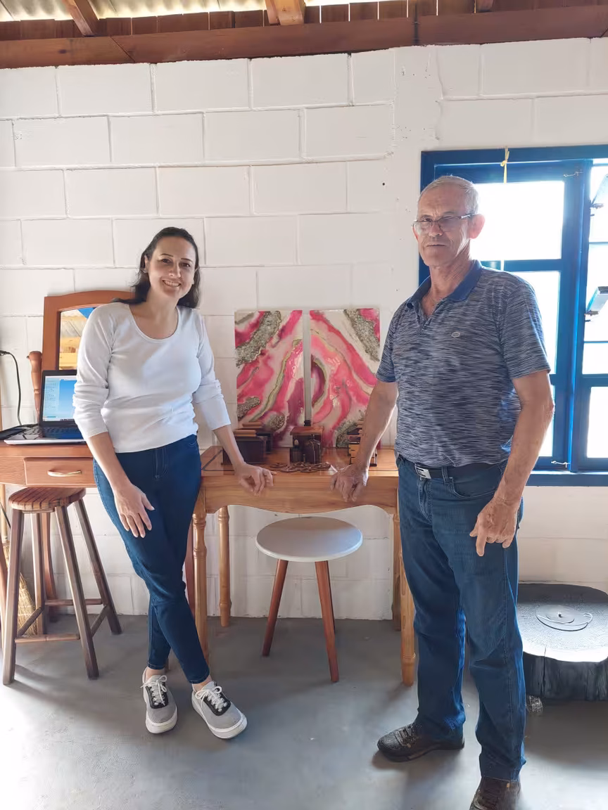 Sua trajetória artística teve início há 21 anos, enquanto ainda trabalhava na Centrais Elétricas de Santa Catarina (Celesc). Na época, ele recolhia cruzetas de madeira descartadas pela empresa e as convertia em banquinhos.