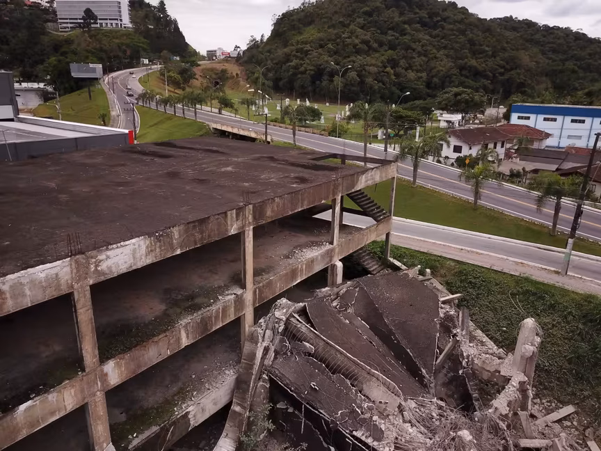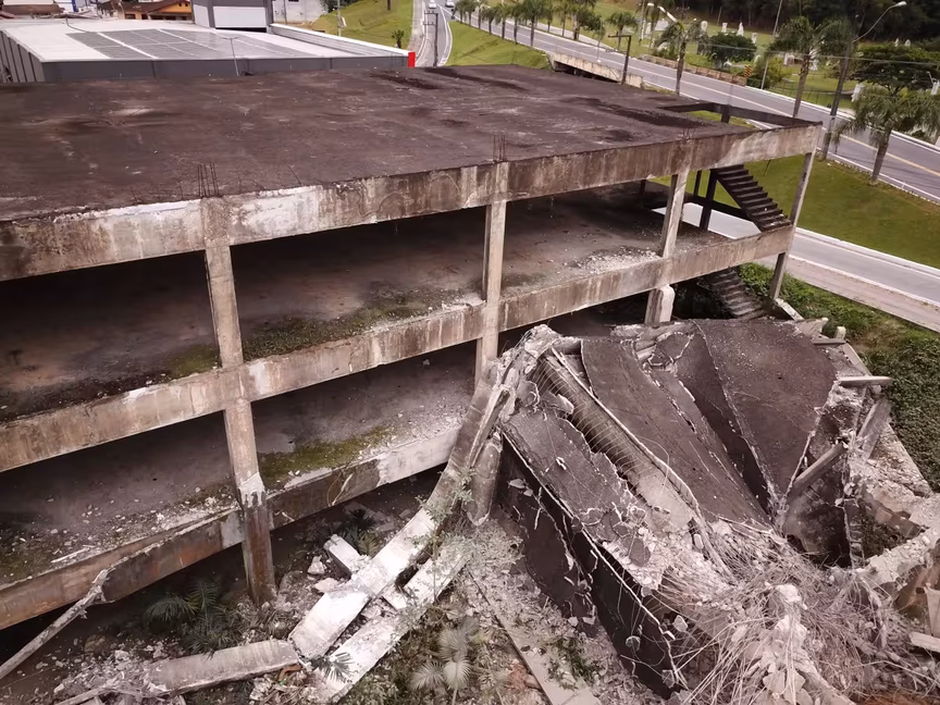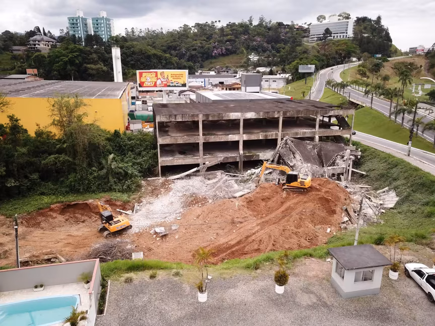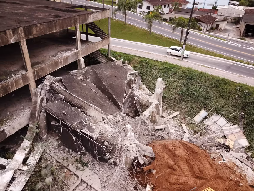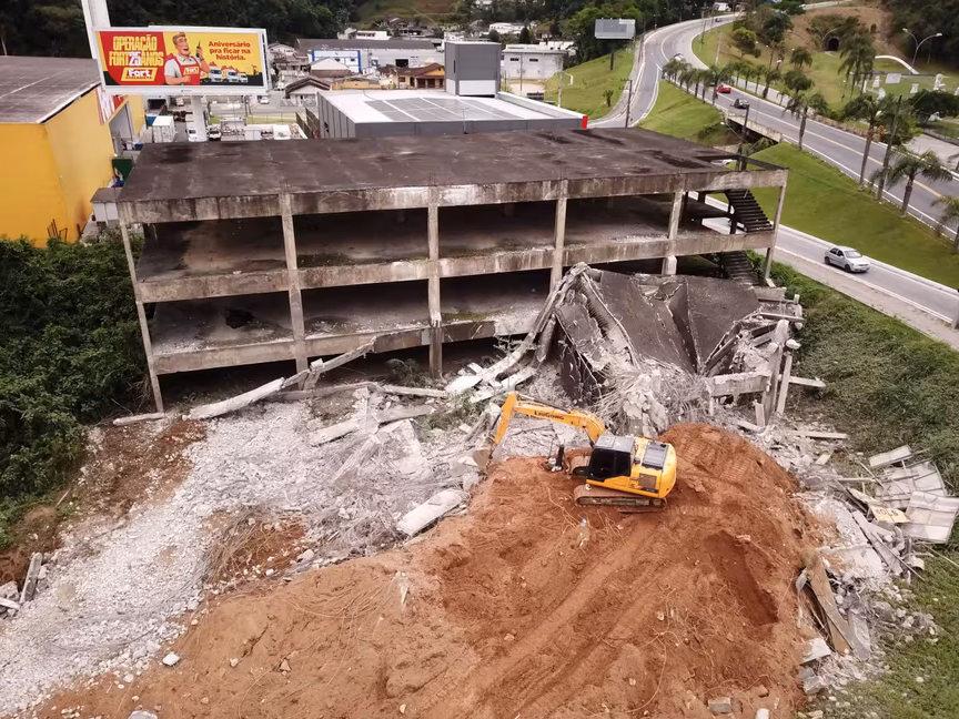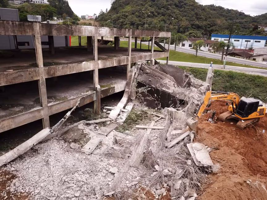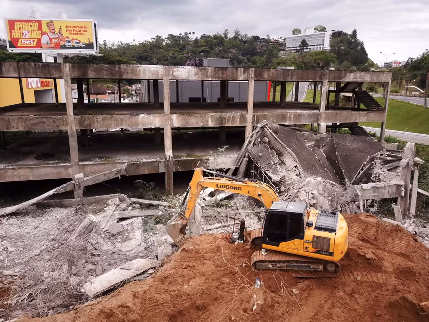 A estrutura, pois, que um dia foi planejada para abrigar o ambicioso Brusque Outlet Center, agora cede espaço à ação das máquinas, marcando o fim de uma era para a cidade.