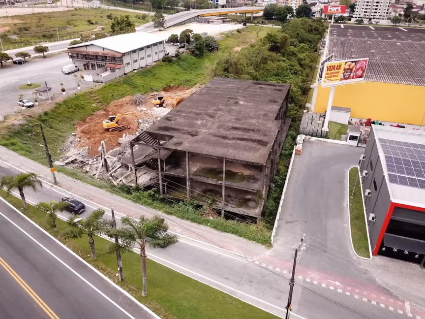 Imagens aéreas capturadas por drone nesta segunda-feira, 28, destacam a demolição de um prédio abandonado há quase três décadas, localizado às margens da rodovia Antônio Heil, em Brusque.