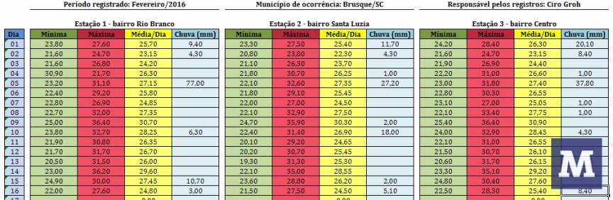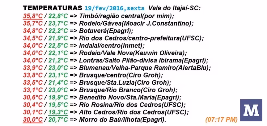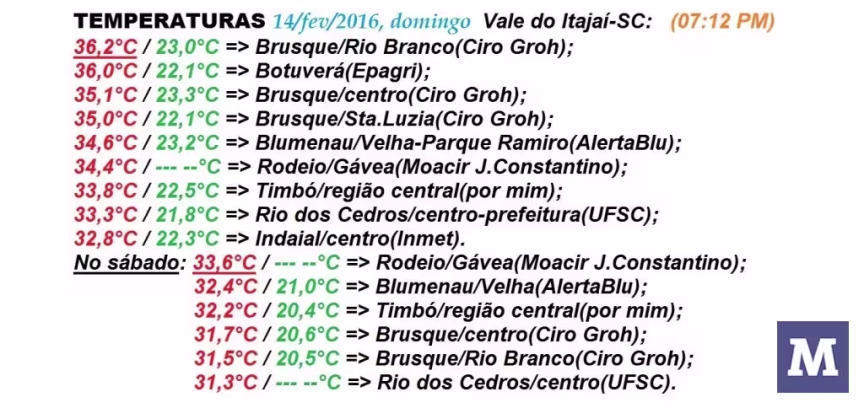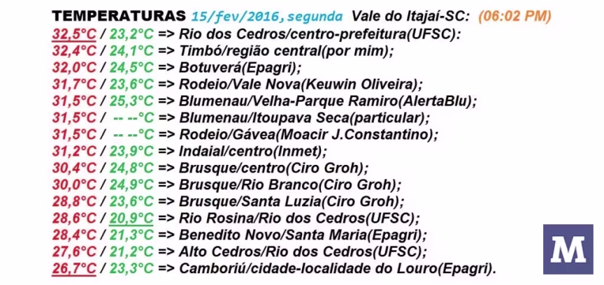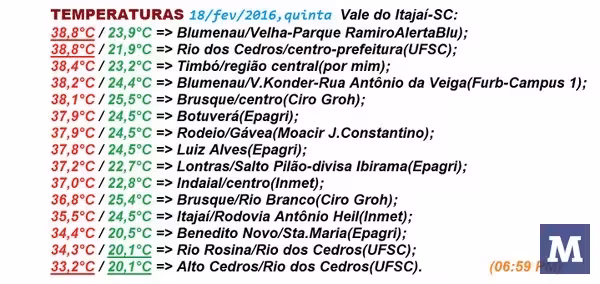 Fevereiro/2016 segue com média/parcial de temperatura dentro do padrão do verão em Brusque-SC