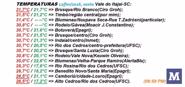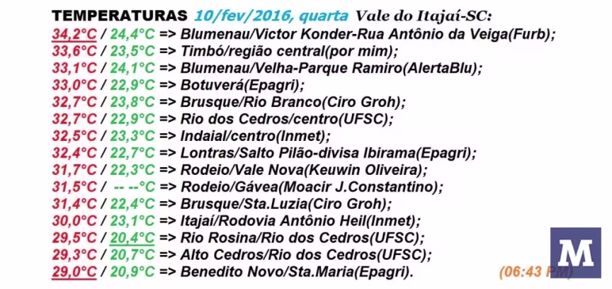 Temperaturas extremas em Brusque-SC nesta terça-feira (09)