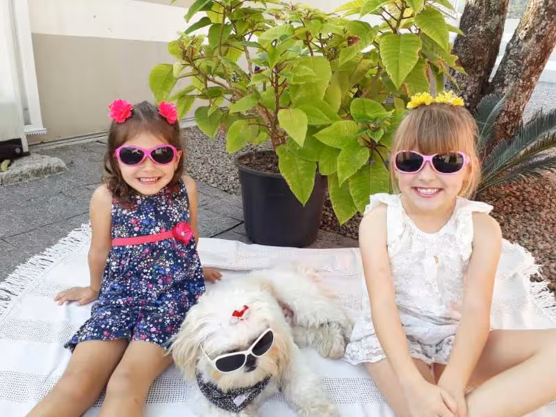 As lindas Maria Eduarda e Manuela Westarb com o cachorrinho Kevin