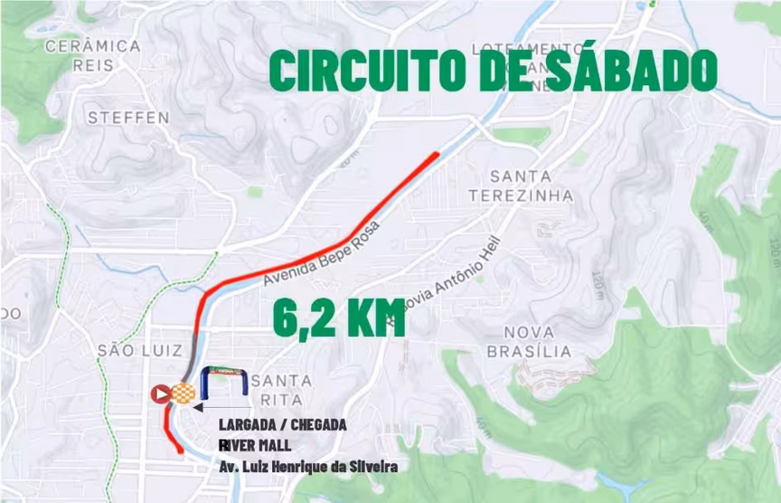 A largada é feita na margem esquerda da avenida Beira Rio, nos fundos River Mall, próximo ao Toolbox Bar. Os ciclistas pedalam rumo à chamada ponte dos Bombeiros. Antes da saída para a rua Carlos Gracher, é dada meia-volta, com o trajeto se estendendo até cerca de 700 metros antes da ponte João Libério Benvenutti, a Ponte da Bilu. Com o retorno neste ponto, uma volta se completa no River Mall. São 6,2km ao todo.