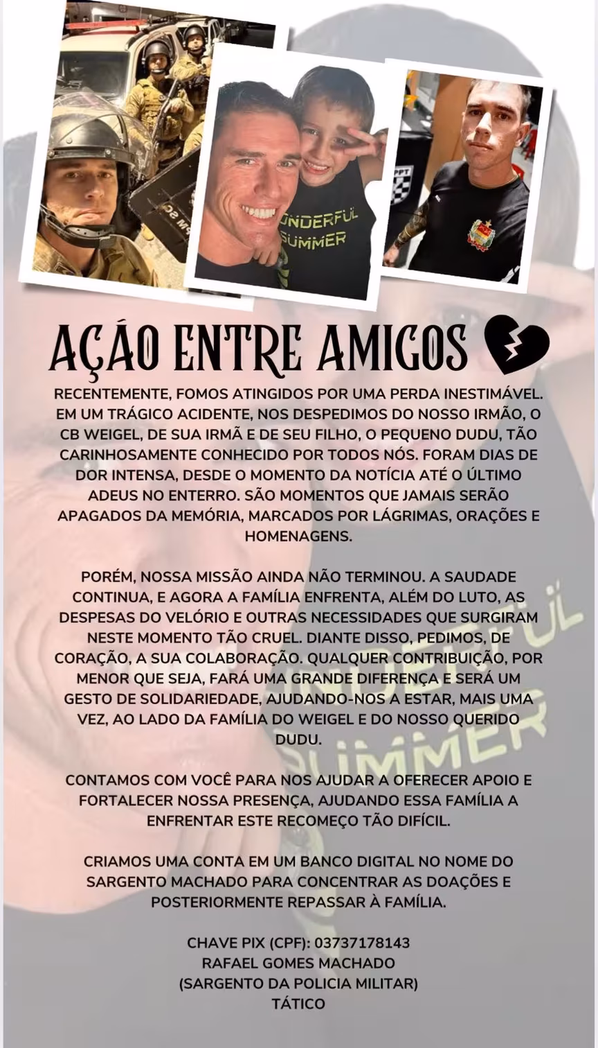 Familiares e amigos de Fernando Weigel criaram uma ação para ajudar a custear o velório do ex-policial militar de Brusque, seu filho e sua irmã, que morreram após um grave acidente no Oeste de Santa Catarina.