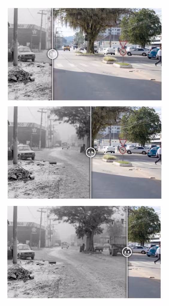 Todas as fotos do especial estão disponíveis com recurso especial: uma ferramenta que possibilita comparar em detalhes as mudanças de cenário, com a foto atual sobreposta à antiga. Basta clicar ou tocar no centro da foto e arrastar a seta à direita ou à esquerda, como na imagem a seguir. Para ler a legenda, basta clicar na caixinha dourada abaixo de cada foto.