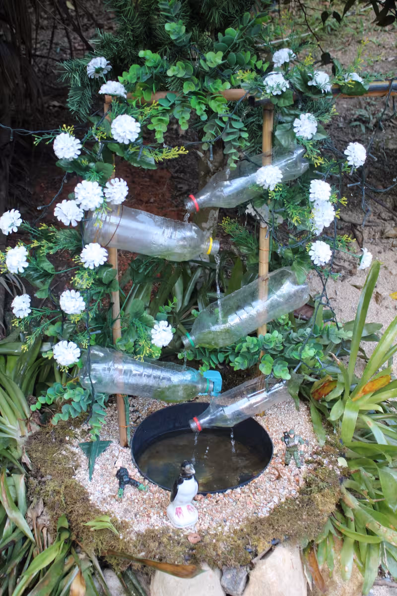 Para fazer os enfeites, Vera e a irmã juntaram algumas peças decorativas que já possuíam, como pisca-piscas e o pinheirinho, e também confeccionaram itens como uma fonte feita com garrafas plásticas e um Papai Noel feito com a técnica do patchwork.