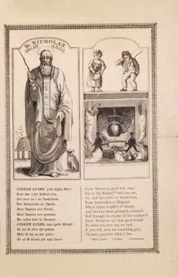 O primeiro indício da figura foi em 1809, em uma história sobre Nova York escrita por Irving. O conto dizia que São Nicolau voava em um trenó e descia por chaminés para colocar o presente das crianças em meias. Ele teria nacionalidade holandesa e por isso se chamaria Santa Claus, porque teve origem no nome holandês, Sancte Claus.