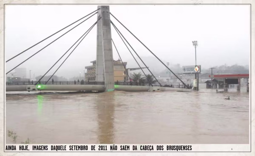Em 2011, foram três vezes que o rio Itajaí-Mirim assustou a população de Brusque elevando seu nível e invadindo as avenidas Beira Rio e seu entorno. Nem o mais pessimista, porém, poderia imaginar que haveria uma quarta vez e esta seria a pior.