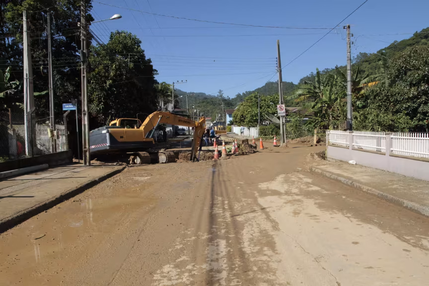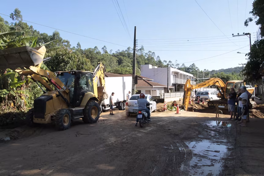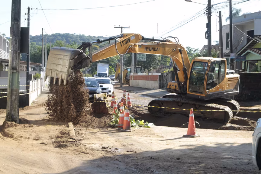O trânsito na rua Arnoldo Ristow segue prejudicado nesta quarta-feira, 19, devido ao cedimento de parte de uma galeria no bairro Zantão, em Brusque, que ocorreu na tarde da última terça-feira, 18.