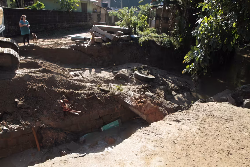 A moradora de uma casa que fica às margens do curso d'água estava em casa no momento em que parte da galeria cedeu e relatou parte do susto. “Começou a dar um início de buraco no asfalto, aí quando eu entrei para dentro de casa com a minha vizinha, a gente só escutou um barulho. Aí quando fomos olhar, o asfalto já havia caído. Foi a força da água que derrubou”.