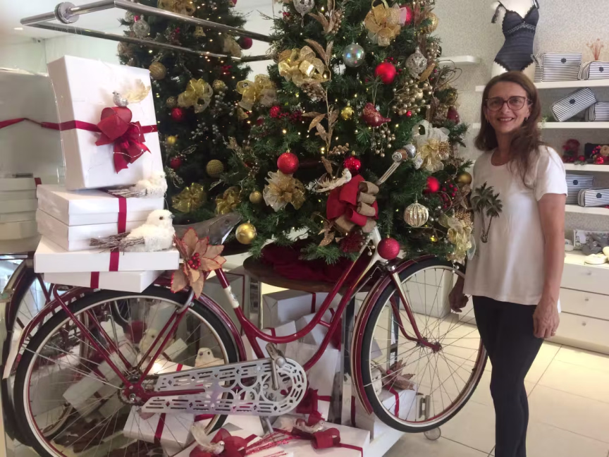 Neste ano, na loja Pele de Seda, no Centro de Brusque, o espírito natalino chegou de bicicleta. "A ideia era contar uma história", explica a gerente Rosita Dada Bruns. Para esse conceito diferente, decidiram incorporar à decoração uma bicicleta antiga, de propriedade da família do marido dela, e enfeitar a loja a partir do cenário criado com ela.