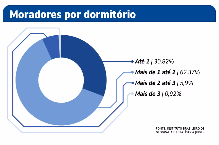 Outros 5,9% dos domicílios tinham mais de 2 até 3 moradores por dormitório. Os domicílios com mais de 1 até 2 moradores por dormitório representavam 62,37% do total, e os domicílios com apenas 1 morador por dormitório alcançavam 30,82%.