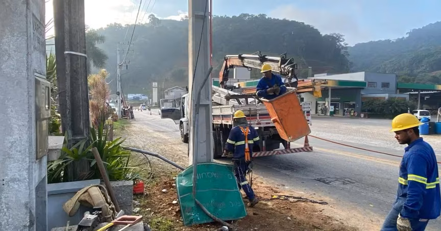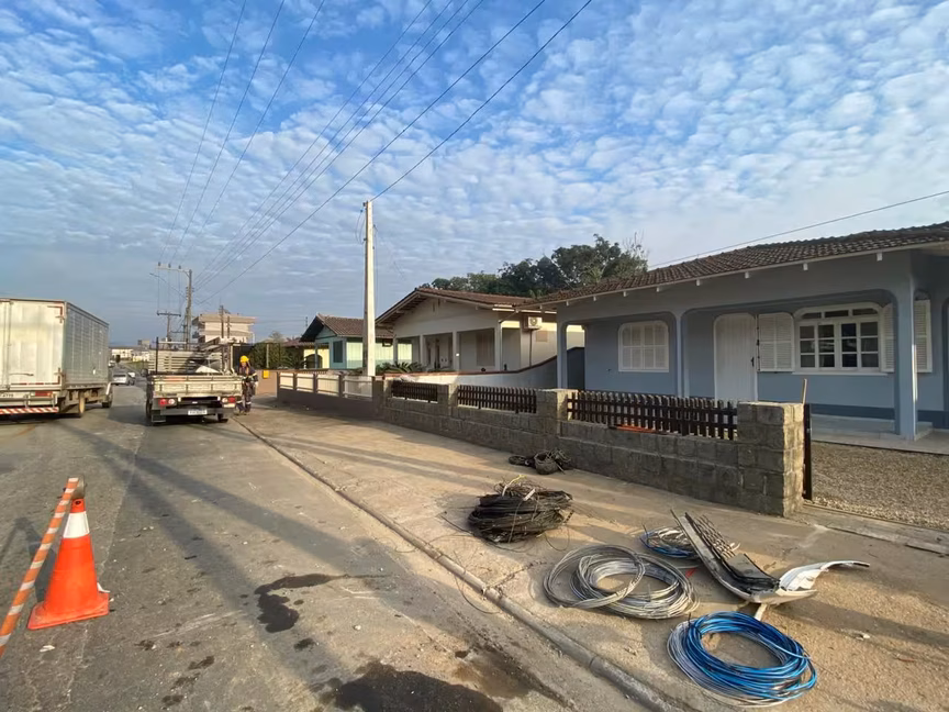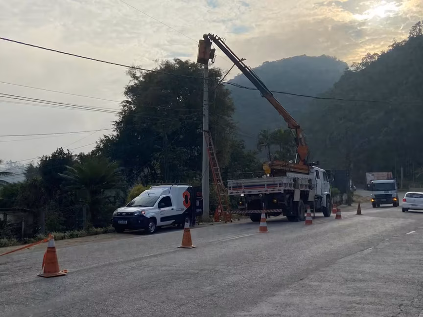 Neste momento, equipes da Celesc estão no local trabalhando para restabelecer a energia na região. Todas as casas da via estão sem luz. A previsão da companhia é de que o serviço retorne em até uma hora. O veículo foi retirado por um guincho particular.