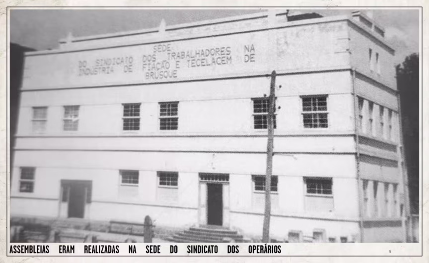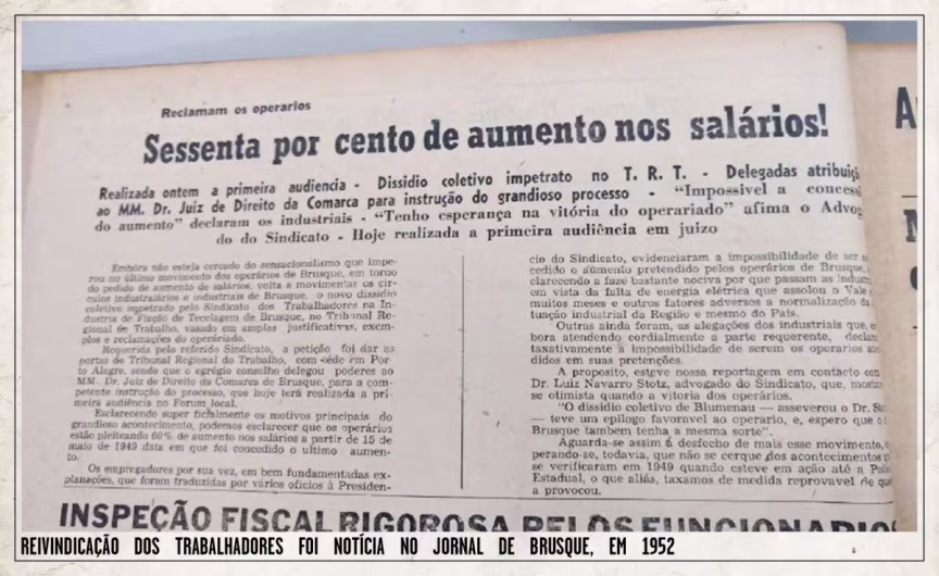 A década de 1950 foi marcada pelo conflito de patrões e operários têxteis em Brusque. São 37 dias de uma greve que transforma o município e repercute nacionalmente. Os trabalhadores das três grandes indústrias têxteis, Renaux, Buettner e Schlösser, e alguns operários de empresas menores, cruzam os braços no dia 19 de dezembro de 1952, reivindicando o pagamento de reajuste salarial.