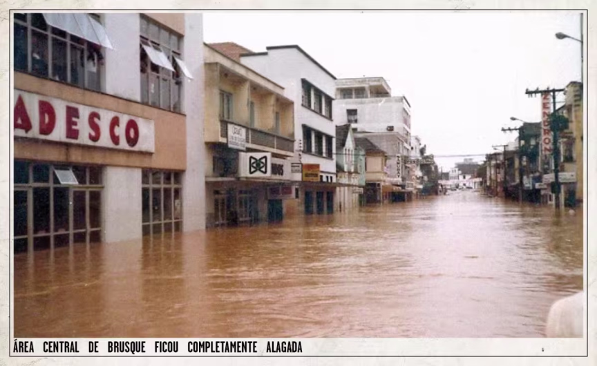 Dois dias depois de completar 124 anos, Brusque viveu aquela que seria considerada a pior enchente de sua história até então. Em 6 de agosto de 1984, após dias de chuva incessante, o rio Itajaí-Mirim mostrou sua força e deixou a cidade inteira debaixo d’água.