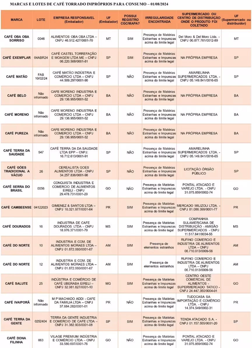 O Ministério da Agricultura e Pecuária (Mapa) divulgou aos consumidores 16 novas marcas de café torrado desclassificadas após a detecção de matérias estranhas e impurezas ou elementos estranhos acima do limite permitido na Portaria nº 570/2022.