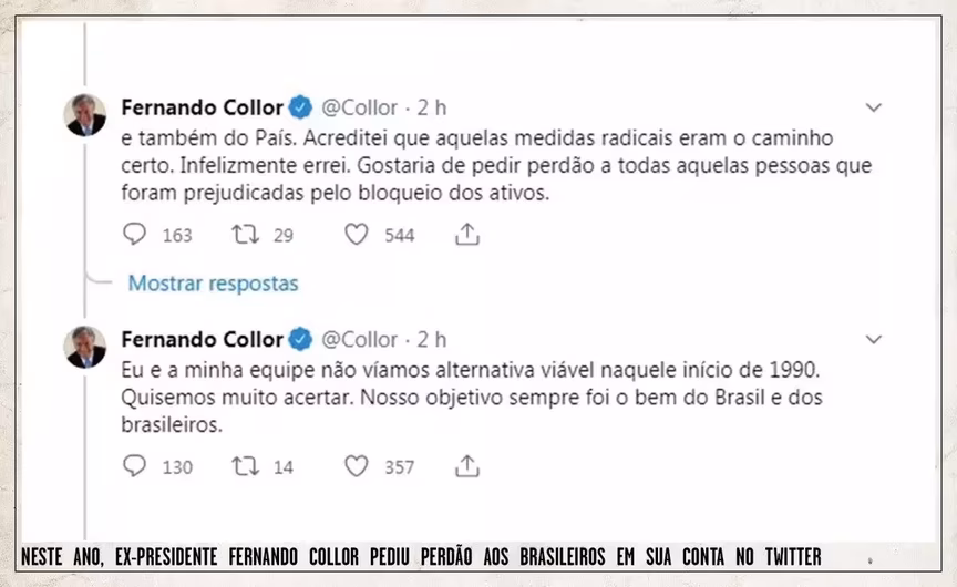“Acreditei que aquelas medidas radicais eram o caminho certo. Infelizmente errei. Gostaria de pedir perdão a todas aquelas pessoas que foram prejudicadas pelo bloqueio dos ativos. Eu e a minha equipe não víamos alternativa viável naquele início de 1990. Quisemos muito acertar. Nosso objetivo sempre foi o bem do Brasil e dos brasileiros”, disse.