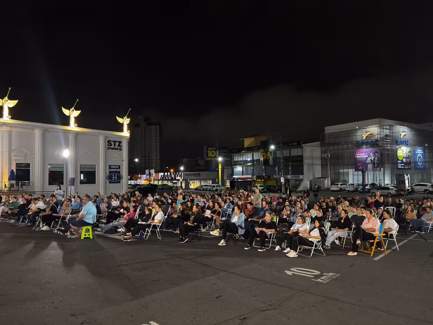 Diversos fiéis compareceram em frente à loja Havan, no Centro de Brusque, para acompanhar a transmissão do Santo Rosário do Frei Gilson, realizado na madrugada deste sábado, 19.