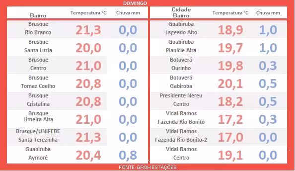 Dando continuidade à edição deste domingo, destacamos agora as informações sobre o monitoramento das condições climáticas então registradas na região brusquense durante a madrugada.
