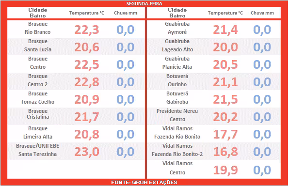 Se as previsões se confirmarem, os moradores de Brusque e o Vale do Itajaí-Mirim como um todo enfrentarão os dias mais quentes do verão até o momento.