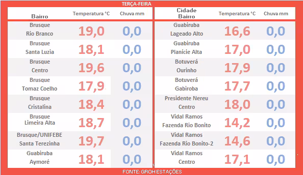Começamos este boletim com informações sobre o tempo seco, que deve favorecer as atividades ao ar livre para os moradores de Brusque e de todo o Vale do Itajaí-Mirim, não apenas nesta terça-feira, mas até pelo menos boa parte da sexta-feira.